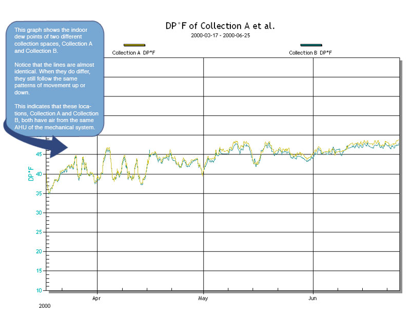 For larger institutions with mechanical systems that serve several rooms, floors, or even buildings, graphing the dew points (both outdoor and indoor dew points) can reveal valuable information about the performance and design of your mechanical systems.